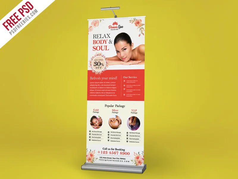 Download Free Beauty and Spa Roll-up Banner Template PSD. This is simple, eye catching & corporate roll up banner is used for any spa salon, beauty salon, skin care salon, spa studio, beauty clinic related businesses. This beauty and spa roll-up banner template is very easy to edit text and you can change images via smart objects very easily .This Beauty and Spa Roll-up Banner Template PSD download contains a 30×70 inches, 300 dpi print-ready CMYK psd files. Hope you like it. Enjoy! Note: Model Images Not Include. Beauty and Spa Roll-up Banner Template PSD