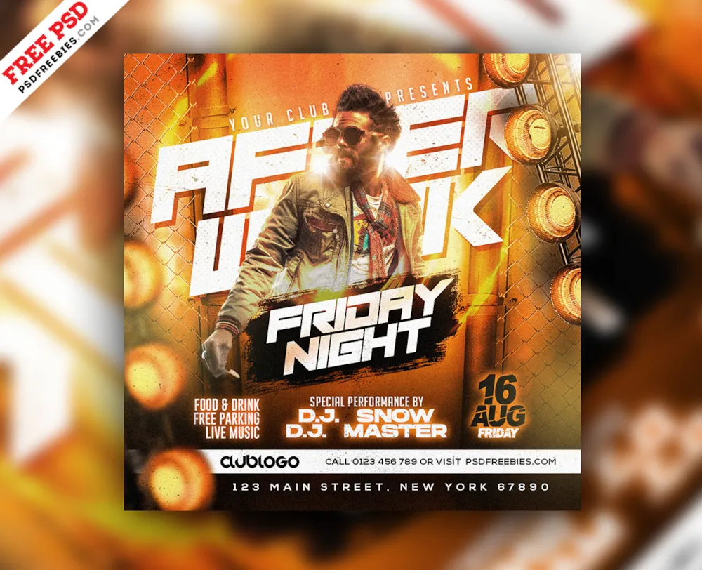The After Work Friday Night Party Social Media Post Design PSD is fully compatible with popular social media platforms like Instagram and Facebook. You can easily share it with your followers, expand your reach, and make a lasting impact on potential attendees.