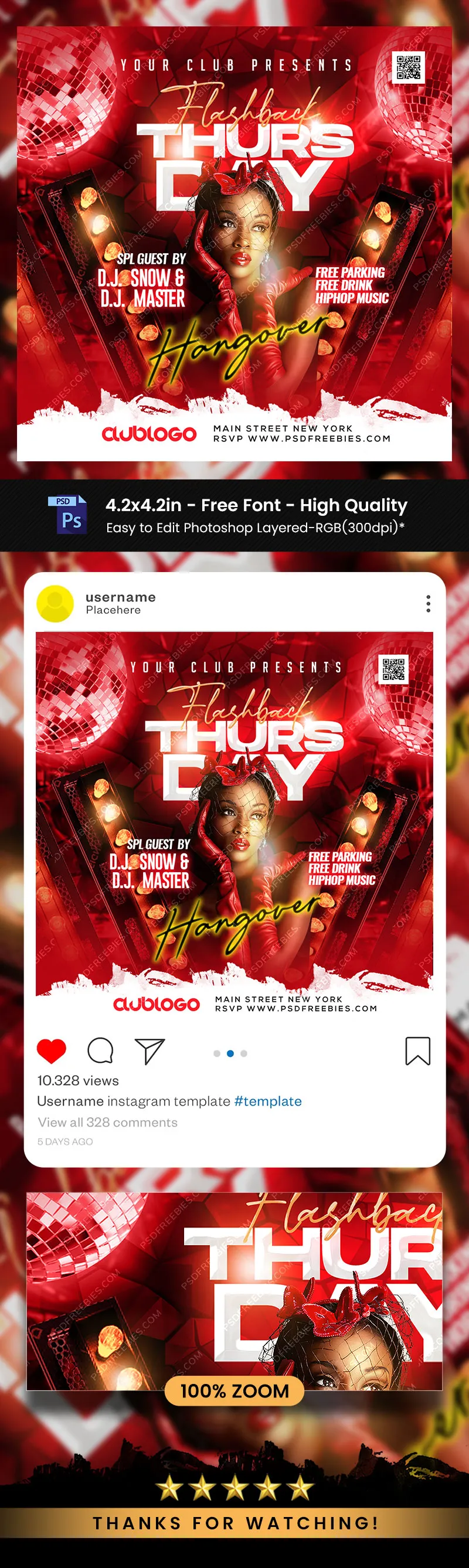 The Flashback Night Club DJ Party Post PSD comes in a square size of 4.25in by 4.25in, making it ideal for social media posts and promotions. With a high-resolution 300 dpi PSD file, you can easily make adjustments and customize every detail using Adobe Photoshop.