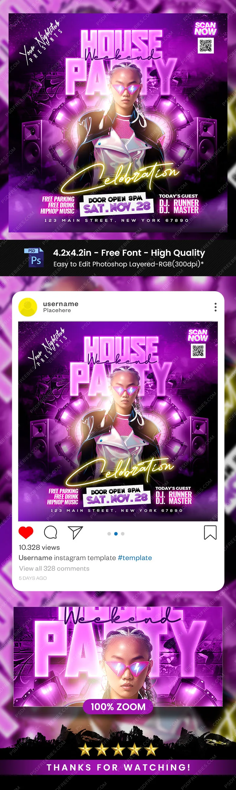 The Weekend House Party Post PSD comes in a square size of 4.25in by 4.25in, making it ideal for social media posts and promotions. With a high-resolution 300 dpi PSD file, you can easily make adjustments and customize every detail using Adobe Photoshop. So, don’t miss out on the chance to create a frenzy of excitement for your weekend night party. Download our Weekend House Party Post PSD and let the madness begin.